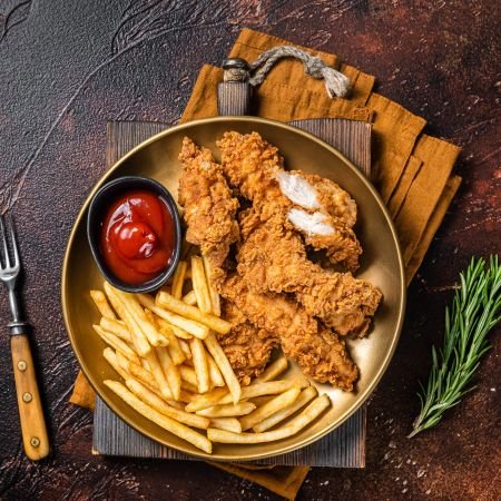 Savor 4pcs Battered Chicken Strips With Fries, featuring juicy chicken strips coated in a crispy batter, served alongside golden fries—a delicious and satisfying meal combo that’s sure to please any palate!