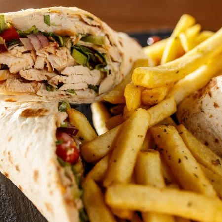 Indulge in a savory Chicken Tikka Wrap, brimming with succulent chicken, crisp veggies, and creamy sauces, accompanied by golden fries—a delectable duo to tantalize your taste buds!
